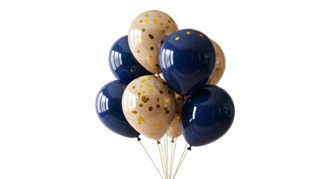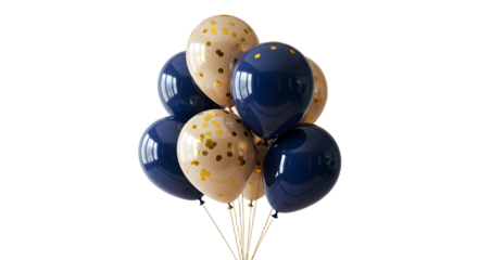Dark blue and gold confetti balloons bouquet isolated on white background, perfect for elegant parties and celebrations