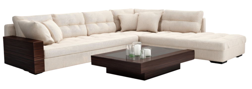 Cream sectional sofa with dark wood accents and a coffee table