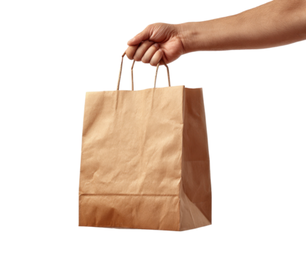 Close-up of a hand holding a brown paper shopping bag against a solid black background