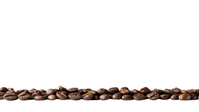 A line of coffee beans and leaves on a white background