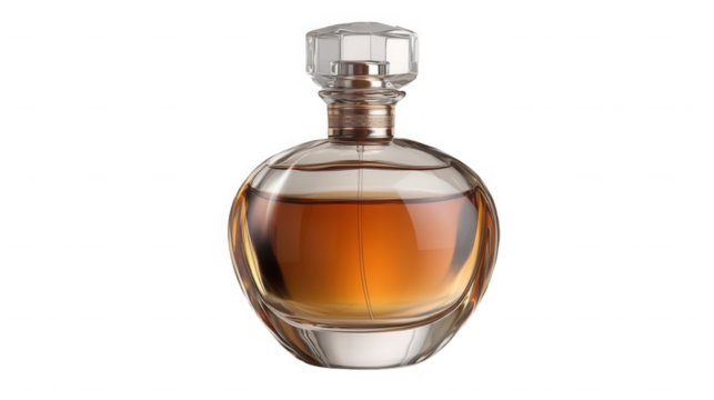An elegantly designed round perfume bottle, filled with a warm amber-colored fragrance, stands gracefully against a dark background.