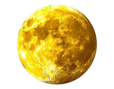 A vibrant, golden-hued full moon, richly textured with craters and subtle shading, set against a stark black backdrop