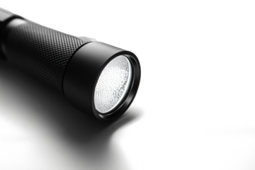 Black tactical flashlight isolated on transparent background, featuring a textured grip