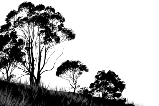Silhouetted trees on a hilltop, dotted with sparkling light, in a dark monochrome landscape