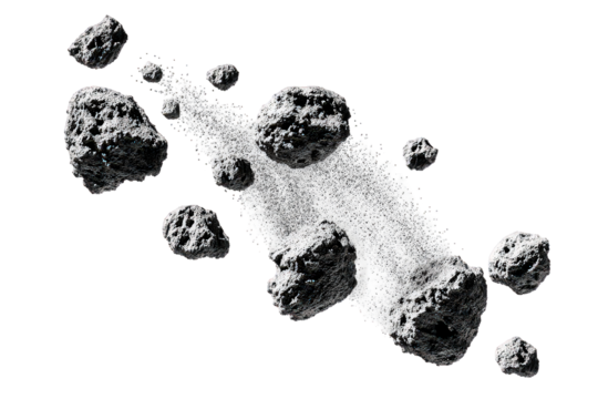Several dark gray rocks are falling against a transparent background