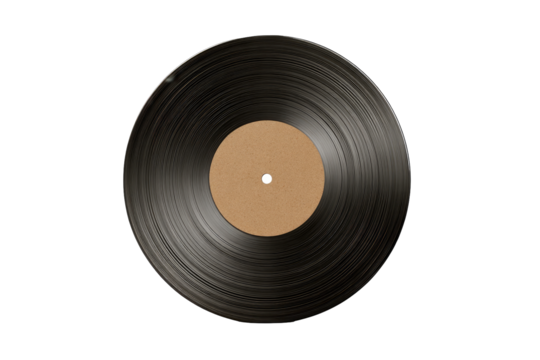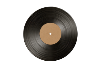 A circular vinyl record, dark grey/black, with a light beige/tan center label