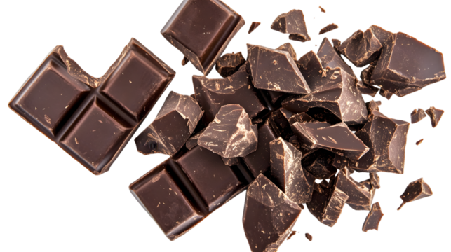 A close up shot of a pile of dark chocolate chunks and a chocolate bar on a black background