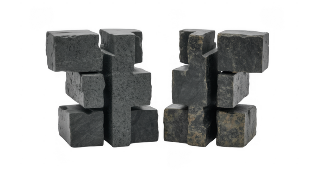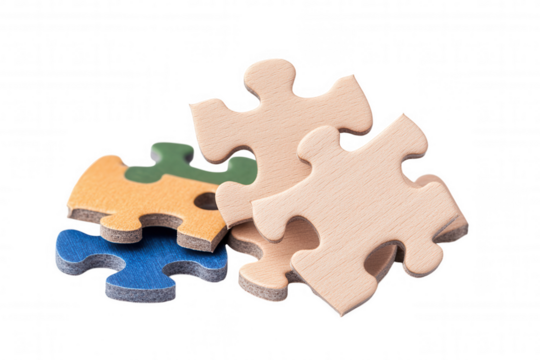 Wooden block puzzle assembling, demonstrating problem-solving, logic, and challenge, with pieces coming together on transparent background
