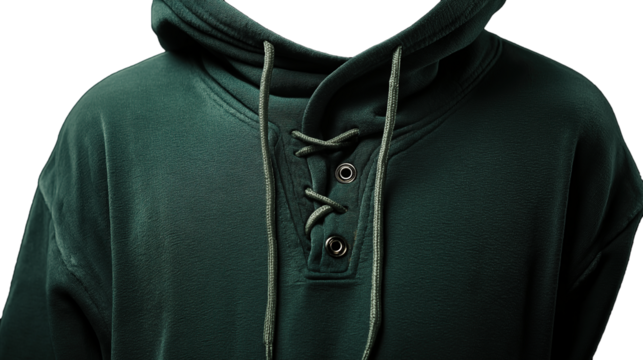 A dark green hoodie with laces on the hood, product photography, studio lighting, close-up