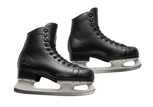 Pair of sleek black ice skates on black background