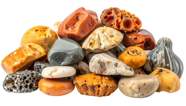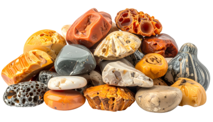 Colorful, smooth, and patterned stones of various shapes, piled together