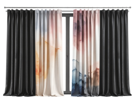 Modern window with dark side curtains and artistic floral patterned sheer curtains