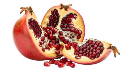 Freshly cut pomegranate displaying vibrant red seeds against a scene