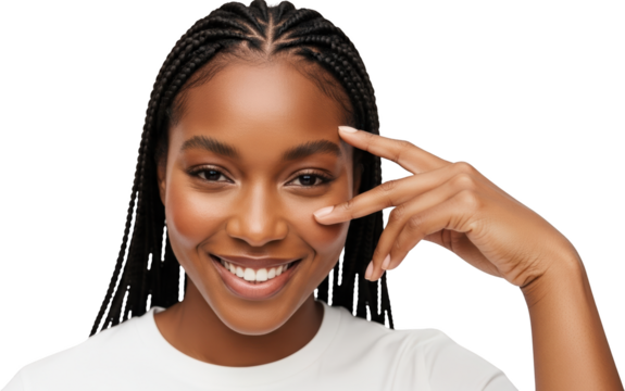 A woman with smooth, glowing skin and dark hair, looking thoughtfully to the side isolated on transparent background
