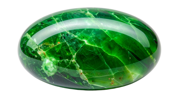 Polished, glossy green stone with internal cracks, oval shape