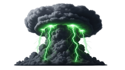 Green lightning storm cloud with dark gray clouds and electric discharge isolated on a transparent background
