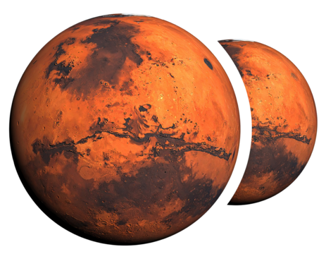 Full view of a rusty-orange planet with light and dark terrain.  Visible surface markings and textures.  Isolated on black background