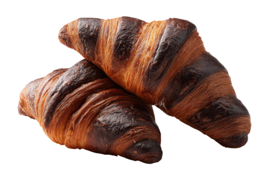 Two chocolate croissants, golden-brown, layered, and slightly darkened