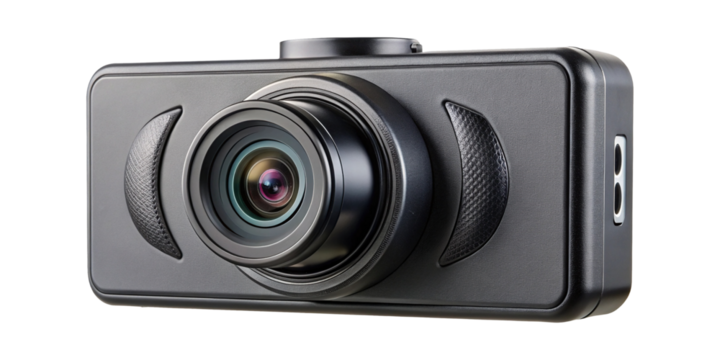 High resolution product photography of black dash camera on white background surface
