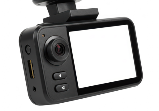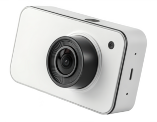 Capturing Moments: A sleek, high-tech dash camera is poised, its lens ready to record, set against a clean background, symbolizing the modern pursuit of safety and visual documentation.