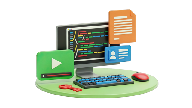 3D Illustration of Computer, Coding, Video, Document, and ID Card
