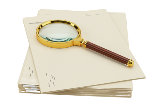 Magnifying glass on stack of papers isolated, investigation and research concept for business and education