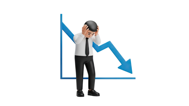 3D Stressed businessman with falling graph on transparent background