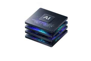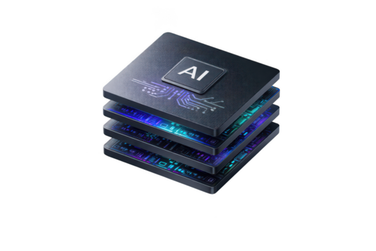 AI processor stack on transparent background, futuristic 3d microchip layers with neon glow, artificial intelligence computing icon for app ui, cloud and automation concept