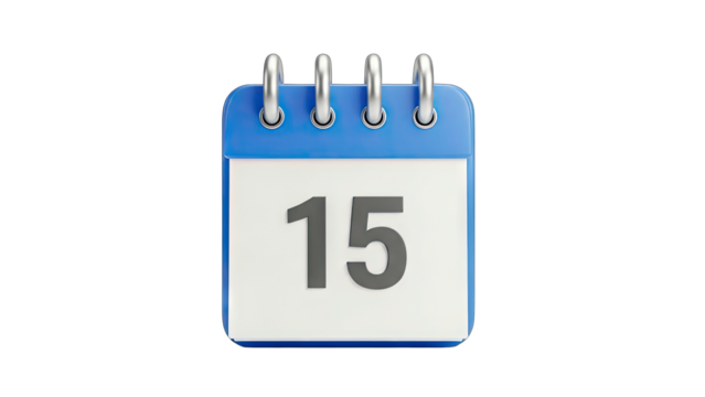 Calendar with number 15 isolated PNG on transparent background, reminder for important date or special event in the month