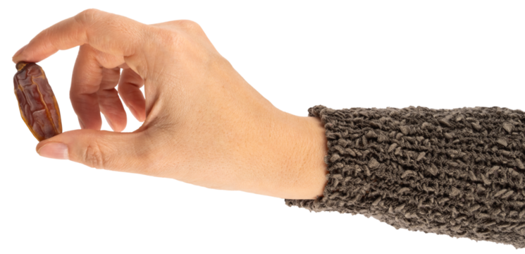 Date fruit, top view image of woman hand holding date fruit with two fingers. Showing, giving, offering special nutrition dessert for breaking fast on Iftar. Ramadan concept image, copy space.