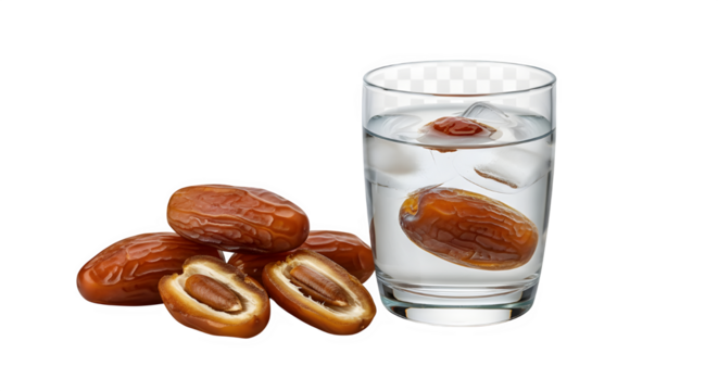 Two fresh dates, one whole and one cut open showing the seed isolated on transparent background
