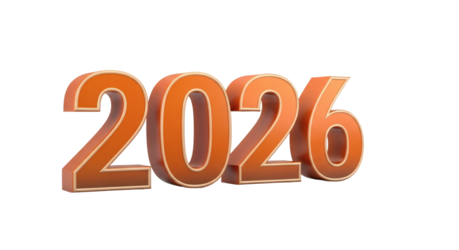 The year two thousand and twenty six displayed in orange with a black background in a three d render on transparent background