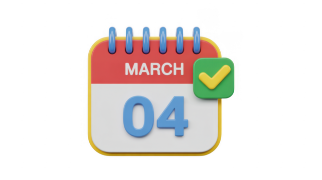Calendar Page with March 4th and Green Checkmark date isolated on a transparent background
