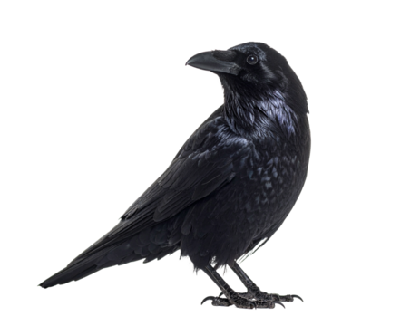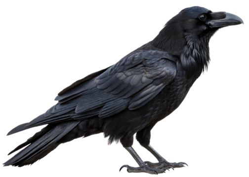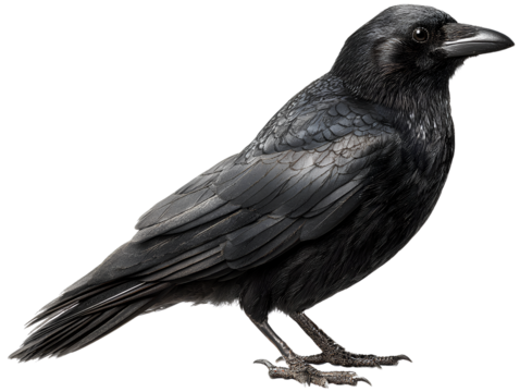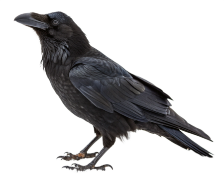 Mysterious black raven bird perched on a branch, showcasing sleek feathers and a sharp beak, perfect for spooky, gothic, or nature-themed designs on transparent background PNG.