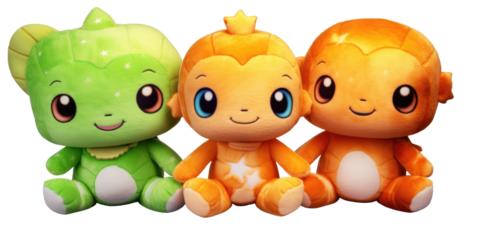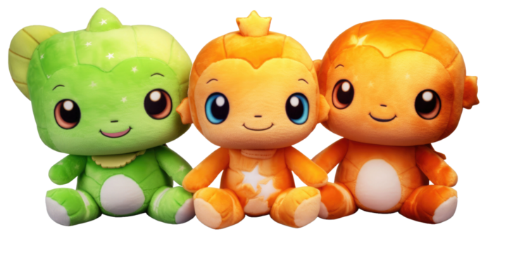 set of 3 stuffed friendly cute alien , turtle and star plushie stuffed soft playtime toys isolated on a transparent background