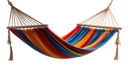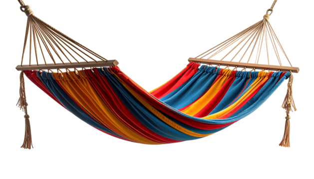 Colorful hammock suspended, striped fabric, wood supports, isolated image
