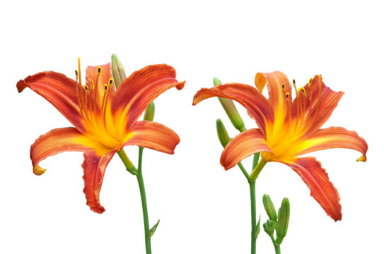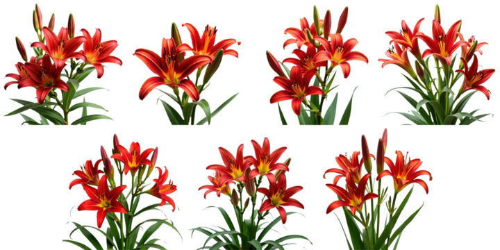 Collection of vibrant red day lilies in various stages of bloom isolated on a transparent background showcasing floral diversity and beauty featuring petals and green foliage.