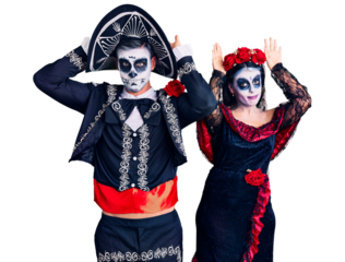 Young couple wearing mexican day of the dead costume over background doing bunny ears gesture with hands palms looking cynical and skeptical. easter rabbit concept.
