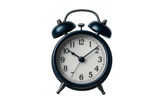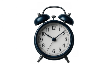 Dark blue vintage alarm clock with twin bells and analog dial, symbolizing time, deadlines, and urgency on transparent background