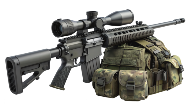 Detailed  shot presents a modern precision rifle, equipped with a scope, set against a black background, placed beside a tactical vest, showcasing textures and design with focus and sharpness.
