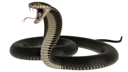 Fierce cobra strikes with open mouth, fangs bared, ready to attack