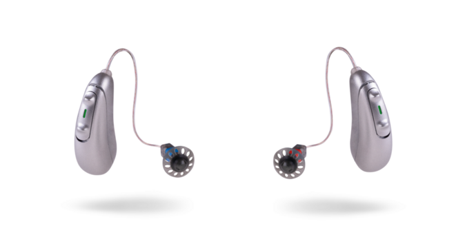 Young man adjusting a modern hearing aid for enhanced hearing, promoting accessibility and innovative sound amplification technology solutions.