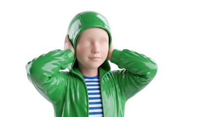 Child in green hooded jacket covering ears