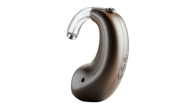 Modern hearing aid device attached to an ear, enhancing auditory function and improving communication for individuals with hearing impairment, isolated on a transparent background