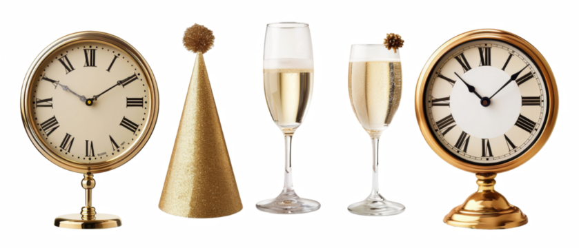 New Year's Eve celebration with clocks, champagne flutes, and party hat.