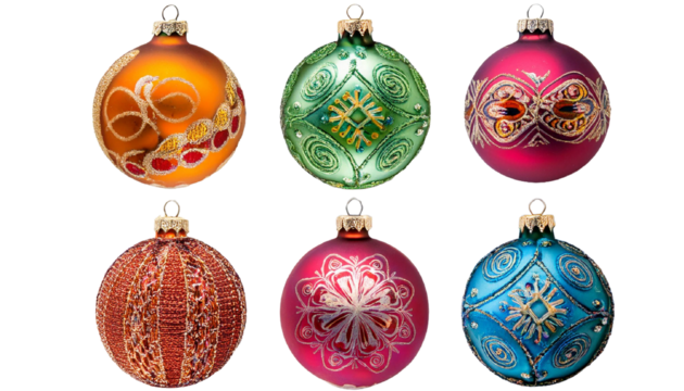 A set of 6 colorful of Christmas baubles with pattern PNG transparent background for Christmas decoration