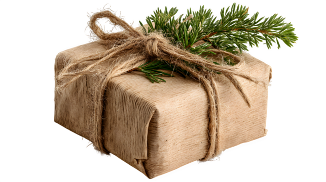 Rustic Wrapped Present with Evergreen isolated on white background