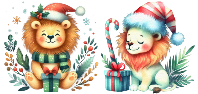 Christmas lion watercolor painting cutout png clip art transparent background