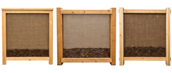 Three wooden compost bins on a transparent background
