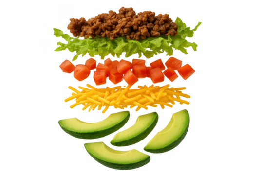 Deconstructed taco ingredients isolated on transparent background, vibrant colors